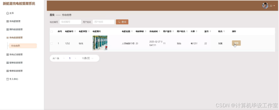 普通管理员充电信息管理功能是对充电过程信息的集中管控模块,界面呈现充电信息列表,包含序号、电桩编号、电桩类型、电桩图片、位置、每度单价、充电时间、用户账号、姓名、车牌等信息。支持通过电桩编号、用户姓名等条件进行查询,快速定位目标充电记录;对于已有的充电信息,可执行查看详情的操作,了解充电过程的具体数据。同时,列表搭配分页控件,能按需选择每页展示的数据数量,便于高效浏览信息。该功能通过清晰的信息展示与精准的查询方式,实现对充电信息的高效管理,保障充电数据的可追溯性与信息的准确传达,助力普通管理员及时掌握充电业务的运行情况。如图5-4所示。