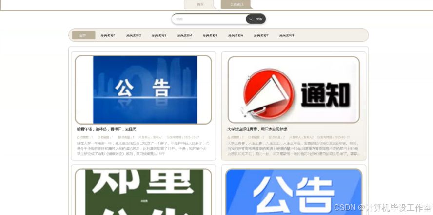 用户公告资讯功能是获取系统相关通知与资讯的模块,界面以卡片形式展示公告内容,每张卡片配有对应图片,便于直观区分资讯类型,同时呈现标题、点赞数、收藏数、发布人及发布时间等信息。支持通过标题搜索框快速定位特定资讯,还可按分类名称筛选不同类别的公告内容。用户可查看每条资讯的详细内容,了解系统发布的通知、活动等信息,提升对充电服务相关动态的知晓度。该功能通过清晰的分类展示与便捷的检索方式,让用户高效获取所需资讯,确保信息传递的及时性与准确性,增强用户对系统服务动态的了解。如图5-6所示。