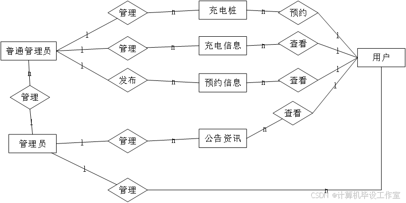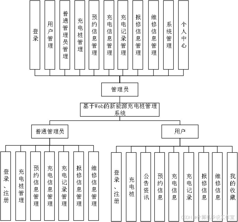 本系统采用按业务功能划分的方式,结合管理员、普通管理员、用户的不同操作需求,明确各角色的功能权限,以此保障充电桩数据、服务流程的安全与有序运转。具体划分为用户管理模块、充电桩管理模块、预约信息管理模块、充电信息管理模块、充电记录管理模块、报修与维修管理模块、系统管理模块等,各模块职责清晰且协同联动:用户管理模块负责不同角色的信息与权限管控,充电桩管理模块聚焦设备基础信息与状态监控,预约、充电相关模块覆盖服务全流程的数据跟踪,报修维修模块衔接故障处理链路,系统管理模块则支撑基础配置与运行维护。