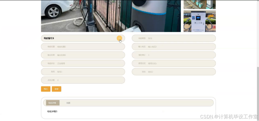 用户充电桩功能是新能源充电服务的核心操作模块,界面展示充电桩的详细信息,包含电桩编号、位置、输出功率、电桩状态、每度单价等内容,搭配电桩实景图片便于直观识别设备情况。用户可在此查看电桩的输入电压、使用方式等参数,同时配备“预约”“报修”功能按钮,支持直接发起充电预约或提交故障报修申请;界面还设有“电桩详情”“地图”选项卡,可查看更详细的设备说明或通过地图定位电桩位置。该功能通过集中呈现电桩信息与便捷操作入口,让用户快速了解充电设备状态、发起服务请求,提升充电服务的使用便捷性,保障用户能高效获取充电相关的信息与服务。如图5-5所示。