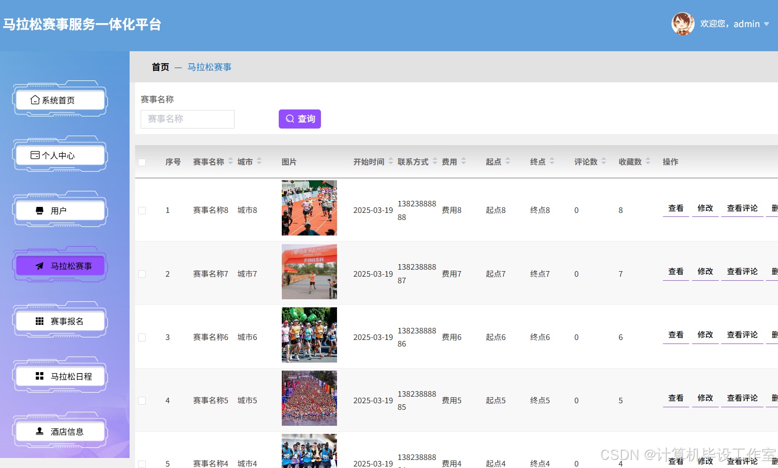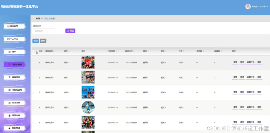 赛事操作:添加新赛事信息(名称、城市、图片、起点、终点、费用等)、修改现有赛事详情、删除过时或无效赛事
