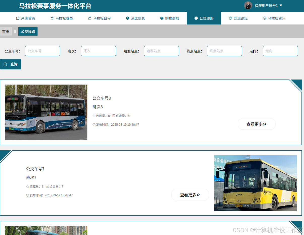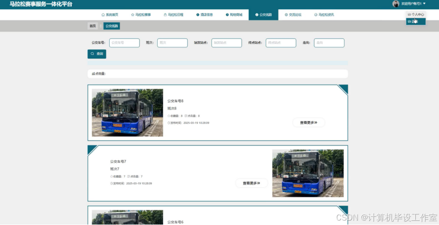 用户公交线路模块的页面上方导航栏有系统首页、公交线路等选项,页面内有公交车号、班次、始发站点、终点站点、走向等多个搜索输入框与查询按钮,下方展示了不同公交车的信息,包括公交车号、班次、收藏量、发布时间以及公交车图片,每个条目旁有“查看更多”按钮。用户在该模块可以通过输入公交车号、班次等信息查询对应的公交线路,点击“查看更多”可获取该公交线路的详细站点、运营时间等内容,也能对常用公交线路进行收藏。公交线路模块模块界面图如图5-6所示。