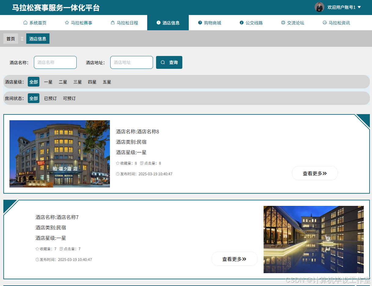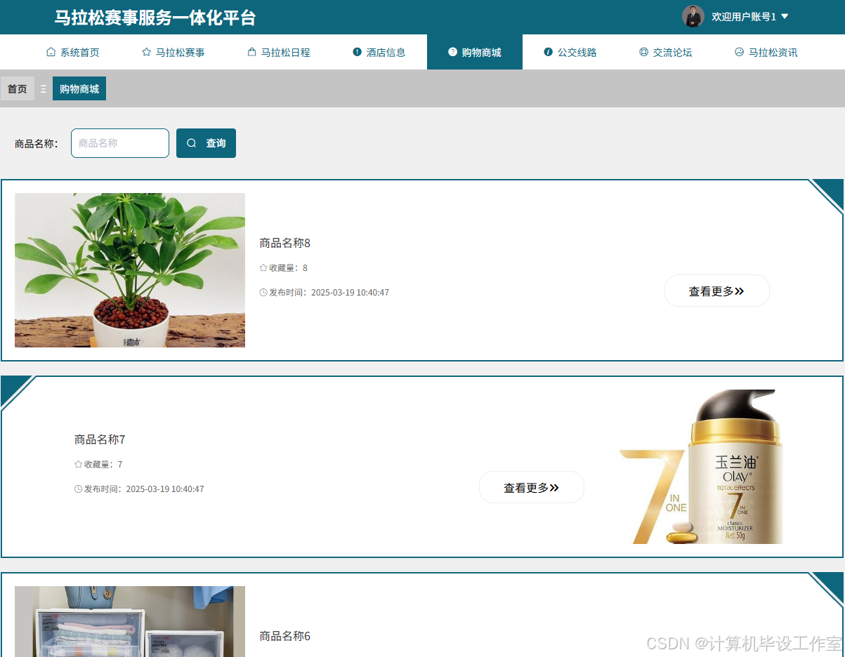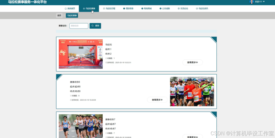 用户马拉松赛事用户端模块对应的页面上方有系统首页、马拉松赛事等导航栏,页面内包含赛事名称搜索框与查询按钮,还展示了不同赛事的信息,包括赛事名称、起点终点、收藏量、发布时间以及赛事相关图片,每个赛事条目旁有“查看更多”按钮。该模块下用户角色可以通过输入赛事名称进行赛事查询,也能点击“查看更多”按钮获取对应赛事的详细信息,同时还能对感兴趣的赛事进行收藏操作。马拉松赛事界面图如图5-4所示。