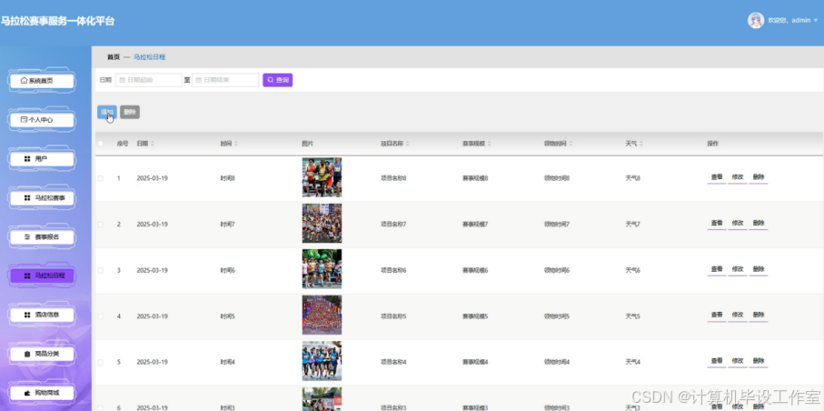 管理员马拉松日程模块的页面左侧导航栏有系统首页、个人中心、用户、马拉松赛事等选项,当前选中的是马拉松日程,页面上方有日期起始和结束输入框、查询按钮,还有添加、删除按钮,下方是马拉松日程列表,包含序号、日期、时间、图片、项目名称等信息,每条信息后有查看、修改、删除操作按钮。管理员在这个模块可以通过日期范围查询马拉松日程,还能执行添加新的马拉松日程、删除现有日程的操作,同时可以查看日程详情,对日程的日期、时间、项目名称等信息进行修改。马拉松日程模块界面图如图5-3所示。