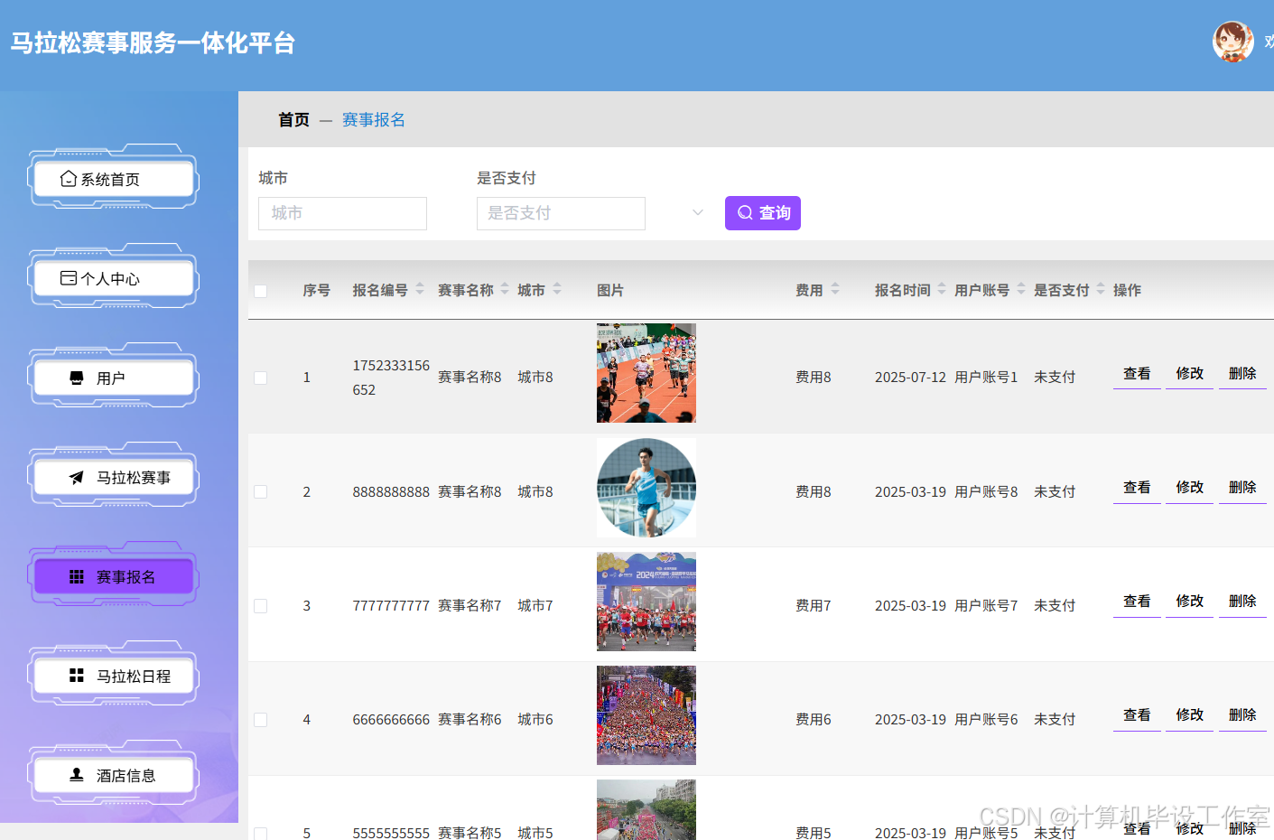 赛事报名管理:维护用户赛事报名数据,包括报名编号、赛事名称、报名时间、支付状态等