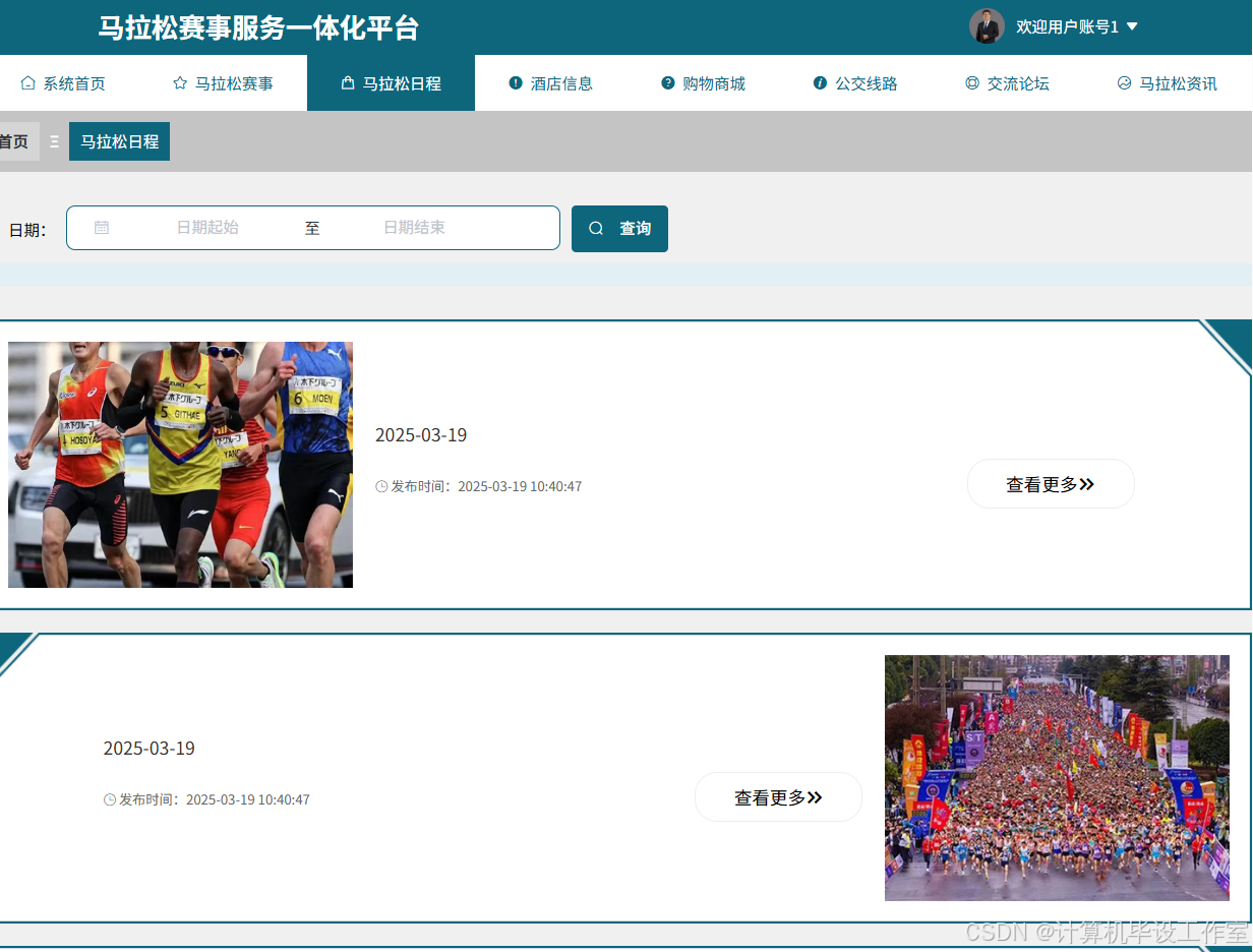 用户马拉松日程用户端模块的页面上方导航栏包含系统首页、马拉松日程等选项,页面设有日期选择的起始和结束输入框与查询按钮,下方展示了不同日期对应的马拉松日程信息,每条日程包含日期、发布时间以及相关赛事图片,同样配有“查看更多”按钮。在这个模块中,用户可以通过选择日期范围来查询对应时间段内的马拉松日程安排,点击“查看更多”能了解该日程的具体内容,比如赛事的具体流程、注意事项等信息。马拉松日程模块界面图如图5-5所示。