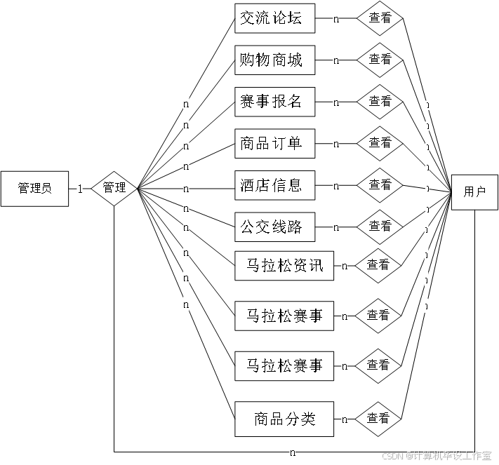 同时设置“用户”实体,用户可对交流论坛、购物商城等实体执行“查看”操作,不同实体与用户的查看关系存在差异:用户与公交线路、酒店信息等实体为一对一查看,即一名用户对应查看一条公交线路或一个酒店信息;而与马拉松资讯、马拉松赛事等实体为多对多查看,意味着一名用户可查看多条马拉松资讯,一条马拉松资讯也可被多名用户查看,此外用户与马拉松赛事还存在“聊天”的多对多关联,支持多名用户针对多个赛事进行交流。