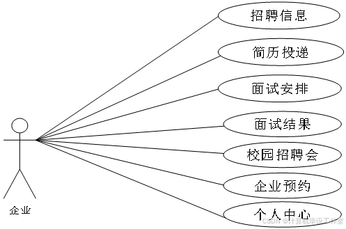 图3-3所示的企业用例图,展现了企业在网站上的主要活动,包括招聘信息、简历投递、面试安排、面试结果、校园招聘会、企业预约、个人中心等功能。这张图为我们提供了关于企业如何与网站互动的清晰视图。