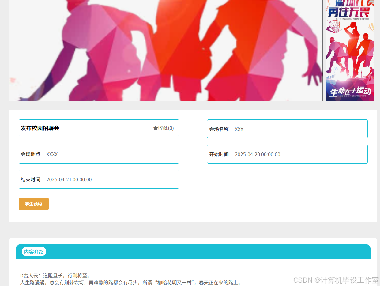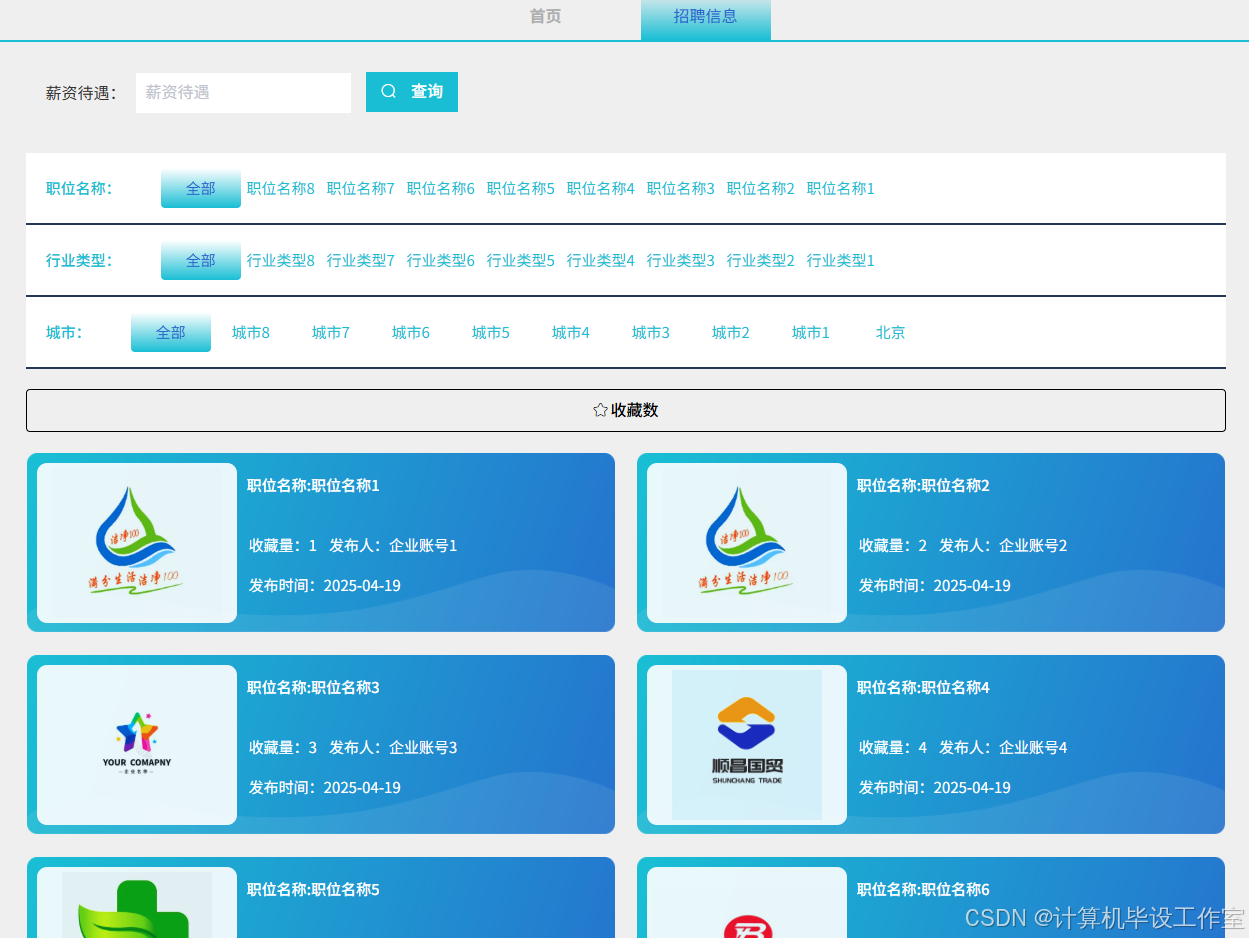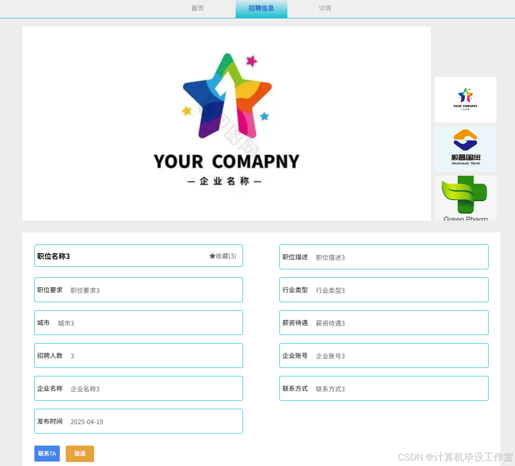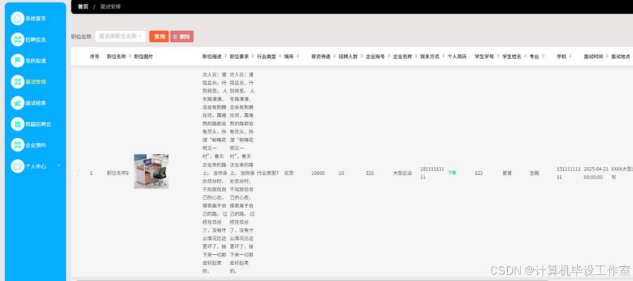 学生点击进入招聘信息界面后,可以查看到每条招聘信息的详细描述,包括职位名称、行业类型、职位描述、招聘人数、薪资待遇等关键信息,以便快速了解职位的基本要求。学生能够直接在界面上提交简历。招聘信息界面设计直观易用,确保学生可以无障碍地浏览和操作。