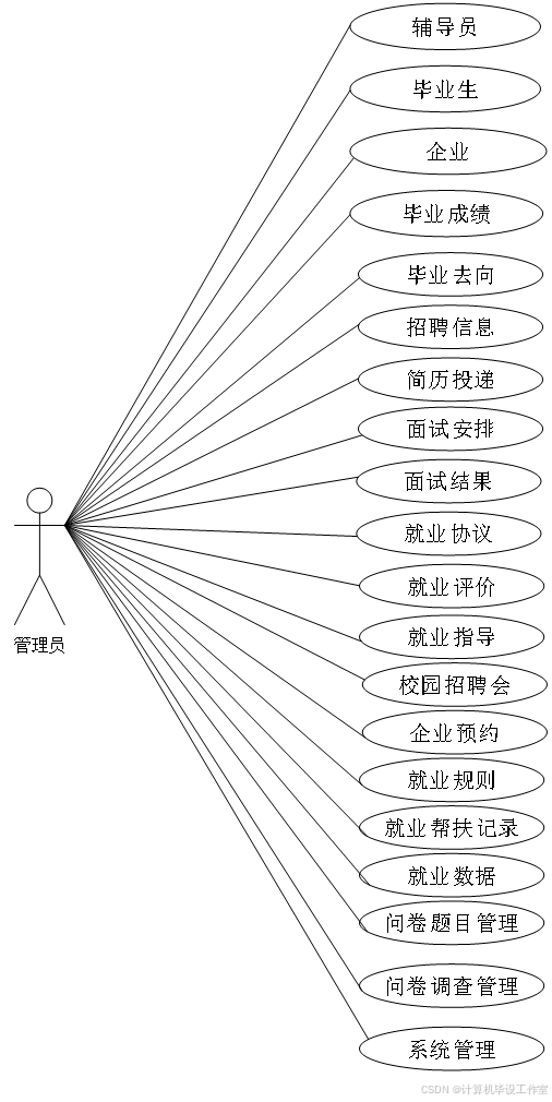 图3-1展示的管理员用例图提供了对管理员在网站中的职责。图中揭示了管理员的核心职能,涵盖了辅导员、毕业生、企业、毕业成绩、毕业去向、招聘信息、简历投递、面试安排、面试结果、就业协议、就业评价、就业指导、就业指导预约、校园招聘会、学生预约、企业预约、就业规则、就业帮扶记录、就业数据、问卷题目管理、满意度调查管理、调查问卷管理、系统管理等功能。这些模块共同构成了管理员在网站运维中的关键角色。