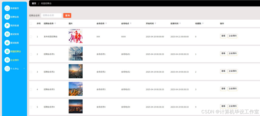 企业在校园招聘会页面可以对所有的校园招聘会内容进行添加、修改、删除操作。页面如下图所示。
