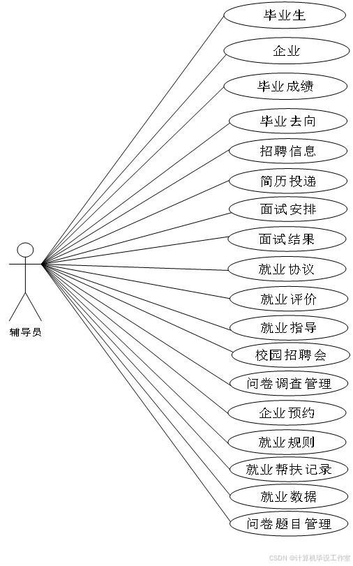图3-4所示的辅导员用例图,展现了辅导员在网站上的主要活动,包括毕业生、企业、毕业成绩、毕业去向、招聘信息、简历投递、面试安排、面试结果、就业协议、就业评价、就业指导、就业指导预约、校园招聘会、学生预约、企业预约、就业规则、就业帮扶记录、就业数据、问卷题目管理、满意度调查管理、调查问卷管理等功能。这张图为我们提供了关于辅导员如何与网站互动的清晰视图。