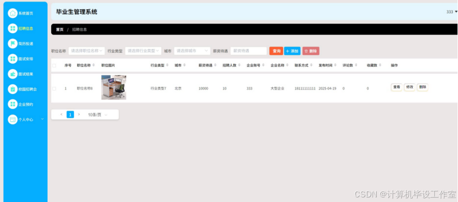 企业进入系统界面后点击“招聘信息”,是可以在列表中对招聘信息进行添加、修改、删除等一系列操作。页面如下图所示。