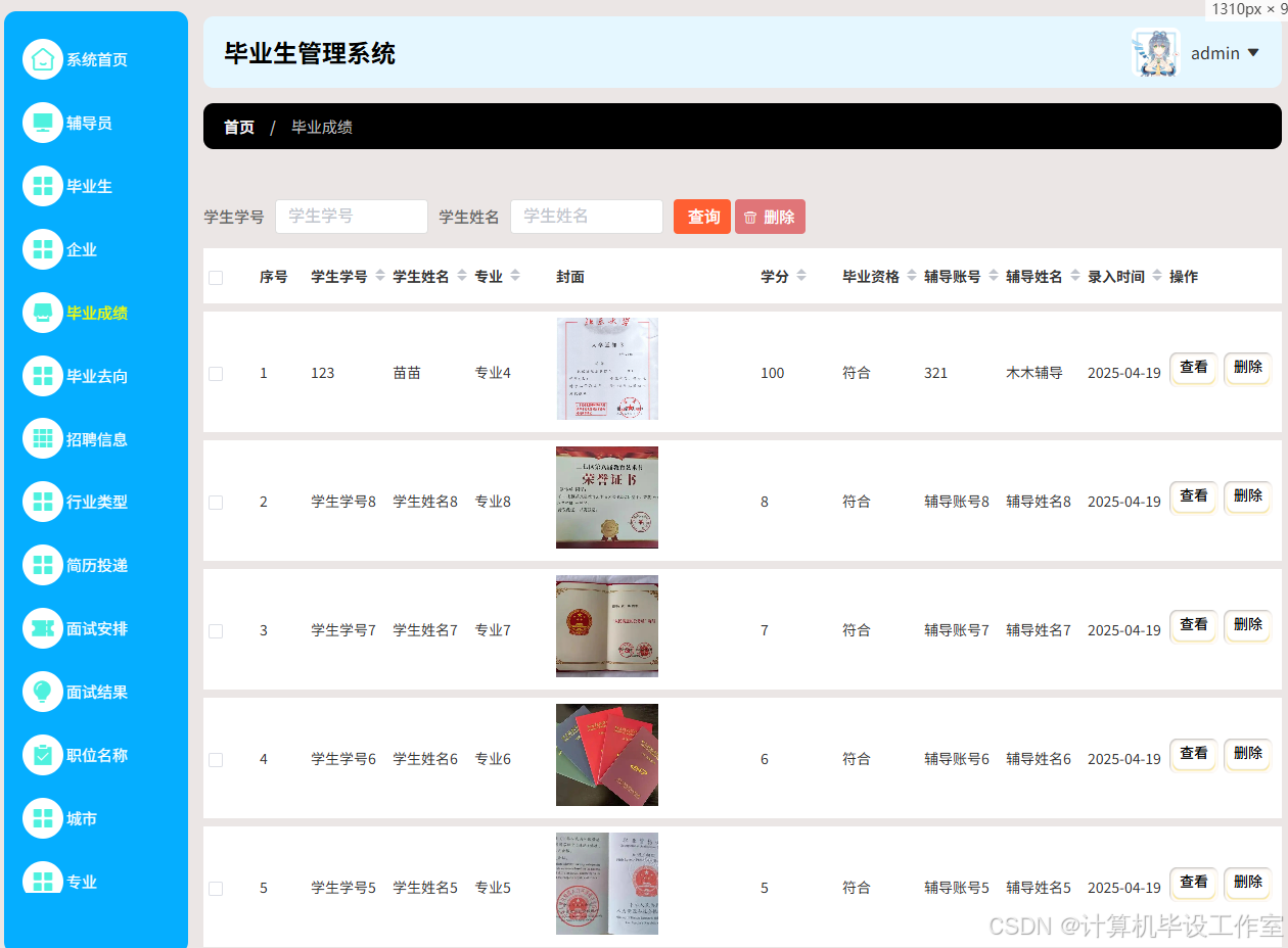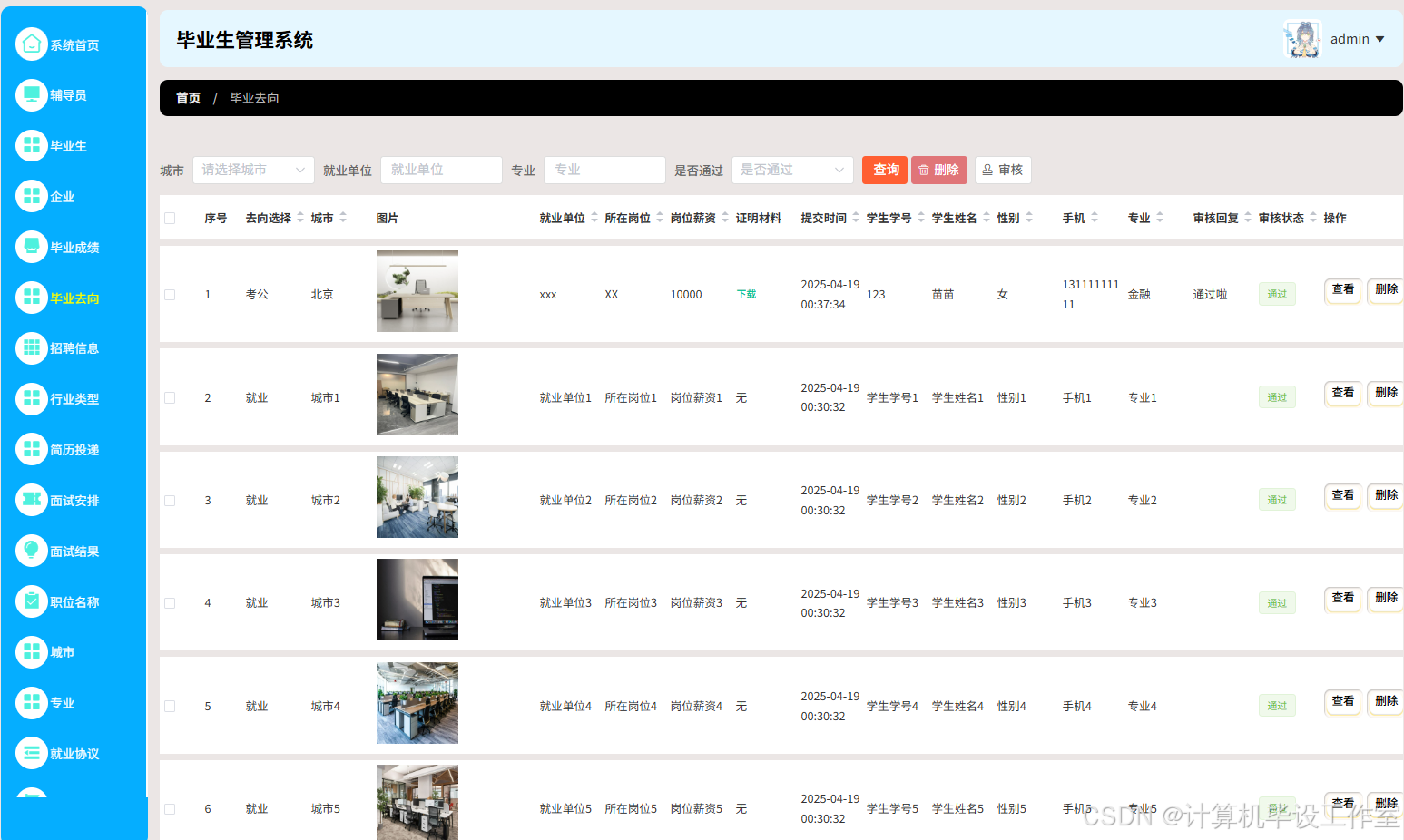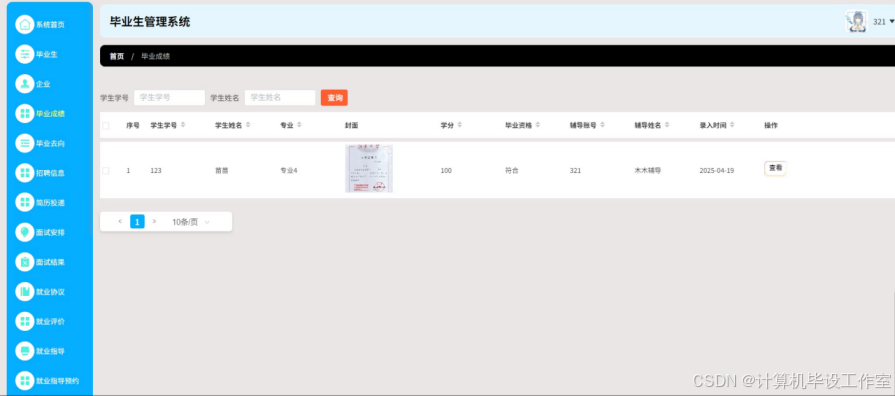 辅导员有权限对学生的毕业成绩进行查看和审核操作,根据学生的毕业成绩审核学生提交的毕业去向。页面如下图所示。