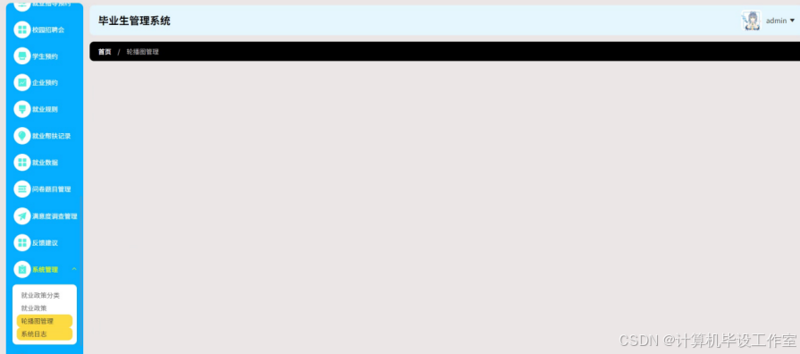管理员在系统管理界面可以对就业政策分类、就业政策、轮播图、系统日志等模块详情进行维护管理操作。页面如下图所示。