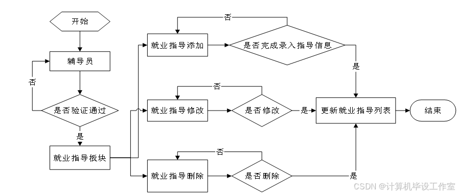 辅导员登录系统后也可对就业指导进行增删改的相关操作,通过登录页面完成登录操作后,在菜单栏进入就业指导板块。可以通过就业指导添加在其添加页面根据文本框内容相应填写后提交完成添加操作,也可以在就业指导管理里对某条就业指导进行修改或者删除操作。图3-8是对就业指导管理的业务流程。