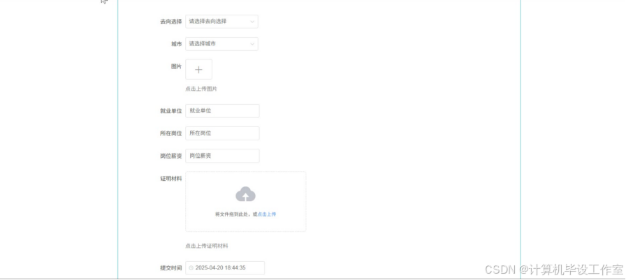 学生点击进入毕业去向界面后,可以填写自己的毕业去向信息,包括选择具体的去向类型如就业、升学或创业等。在填写就业详情时,学生需要输入目标城市、就业单位名称以及所担任的岗位,为了验证信息的真实性,学生需上传相关的证明材料,例如录用通知或合同扫描件等。提交后的信息将被系统记录并用于后续的就业数据分析和统计。毕业去向页面如下图5-6所示。