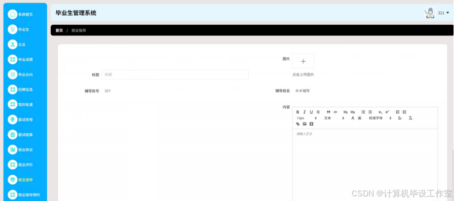 | 就业指导 | 辅导员是否能成功添加就业指导 | 1.在就业指导添加页输入内容。2.点击提交按钮。 | 页面提示请输入撰写内容 | 否 |