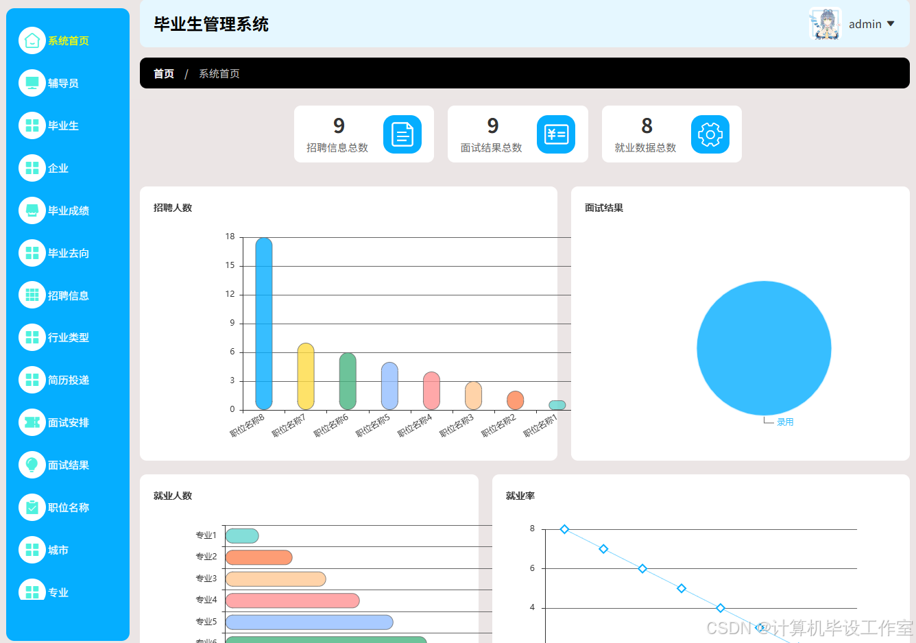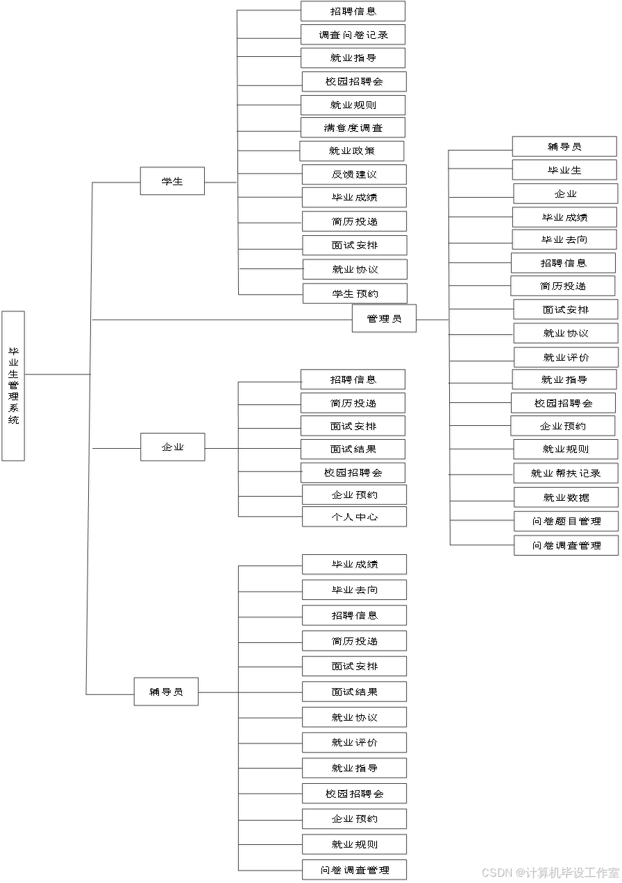 管理员提供了对管理员在网站中的职责。包括了辅导员、毕业生、企业、毕业成绩、毕业去向、招聘信息、简历投递、面试安排、面试结果、就业协议、就业评价、就业指导、就业指导预约、校园招聘会、学生预约、企业预约、就业规则、就业帮扶记录、就业数据、问卷题目管理、满意度调查管理、调查问卷管理、系统管理等功能。