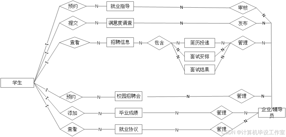 图3-2所示的学生用例图,展现了学生在网站上的主要活动,包括招聘信息、就业指导、校园招聘会、就业规则、满意度调查、就业政策、反馈建议、毕业成绩、毕业去向、简历投递、面试结果、就业协议、就业评价、就业指导预约、学生预约、就业帮扶记录、调查问卷记录等功能。这张图为我们提供了关于学生如何与网站互动的清晰视图。
