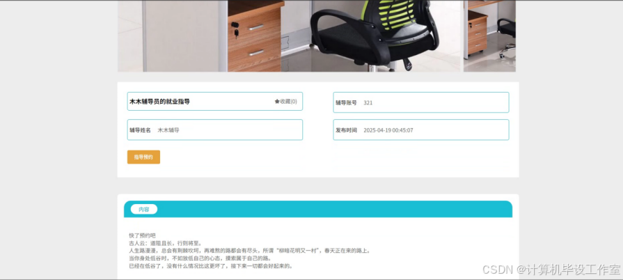 通过首页上的就业指导功能,学生能够直接获取全面的就业指导详情,包括辅导账号、姓名、标题、指导内容等,学生可以在界面中点击“指导预约”按钮进行提交。具体页面展示如图5-4所示。