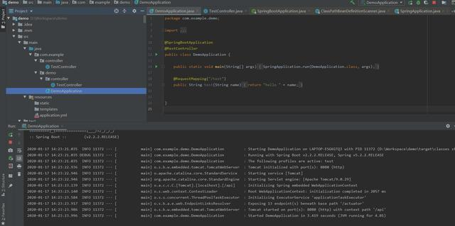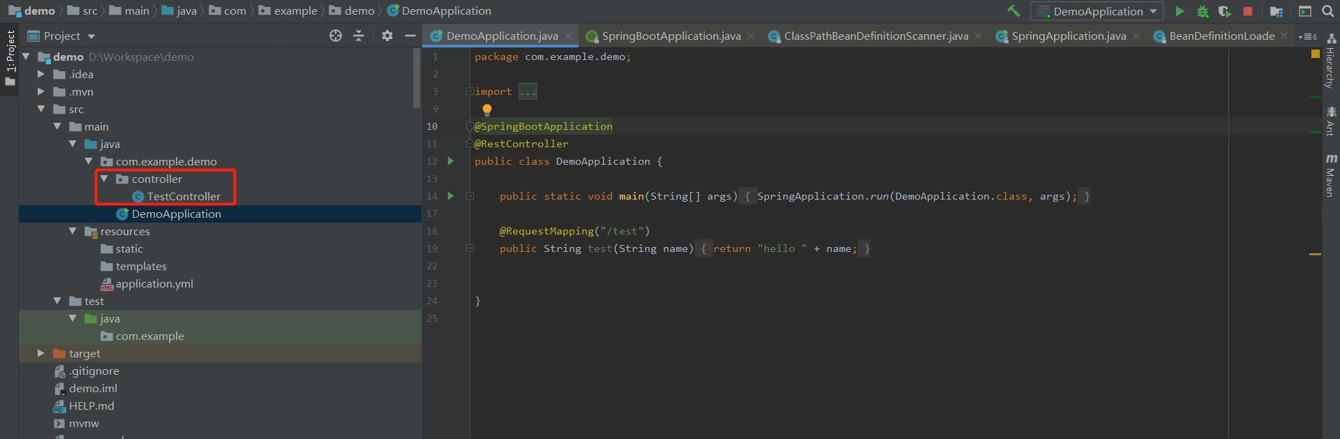 加入我们在com.example包下也建一个controller,并将TestController.java文件复制过去,修改TestController所在包名后run DemoApplication类,程序同样能正常启动,没有报错。