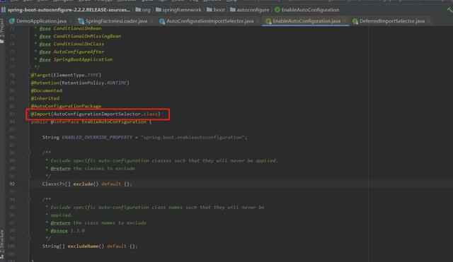 进而继续查看EnableAutoConfiguration注解可以看到AutoConfigurationImportSelector是由EnableAutoConfiguration通过Import注解引入。