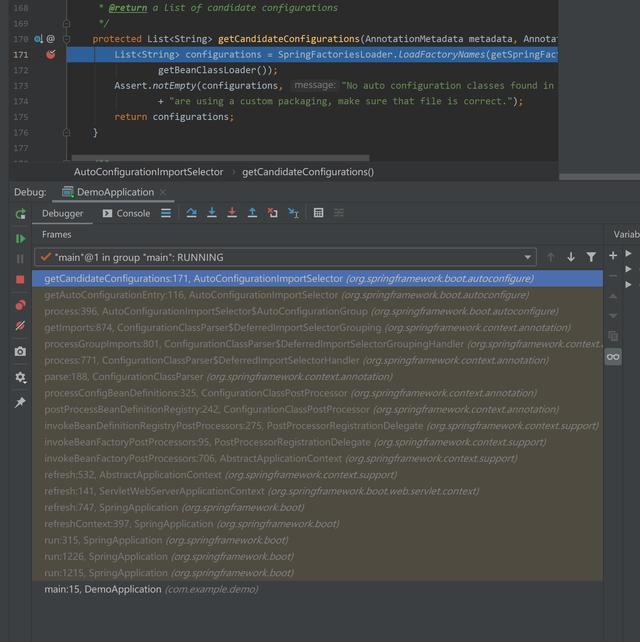 那么到底AutoConfiguration是通过谁引入的呢?我们在getCandidateConfigurations方法内打断点,然后debug模式启动来看个究竟。