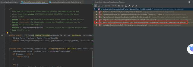 那么反向追踪SpringFactoriesLoader中方法的Callers可知道AutoConfiguration类是何时被加载的,有传入指定类型的只有loadFactoryNames方法和loadFactories方法