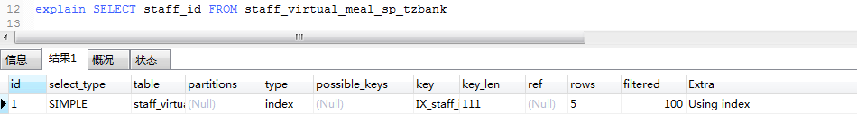 4、Using index: 表示查询的列被索引覆盖,这个是查询性能比较高的体现,即所要查询的信息搜在索引里面可以得到,不用回表,索引被正确的使用。假如同时出现了using where,表示索引用于执行索引键值的查找;若是没有出现using where,则表示索引用于读取数据,而非执行查询的动作。