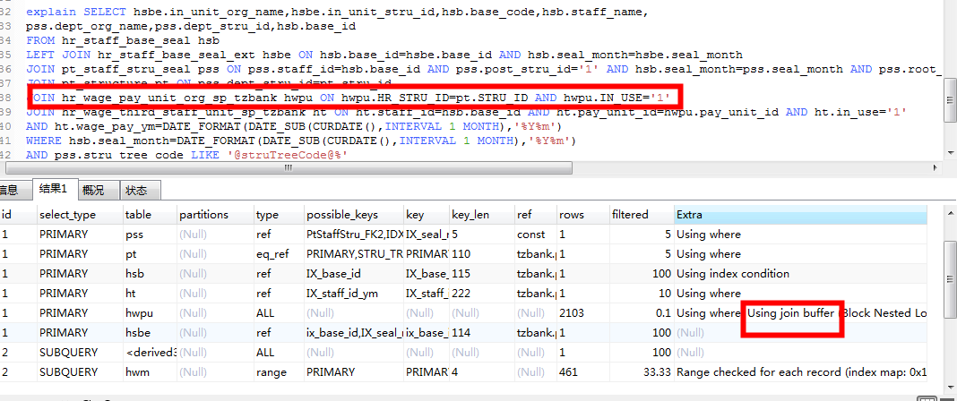 10、Using join buffer Using join buffer表示使用连接缓存,它强调在获取连接条件时,并没有使用索引,而是使用连接缓冲区来存储中间结果,若是出现该值,一般说明需要添加索引来进行优化了。