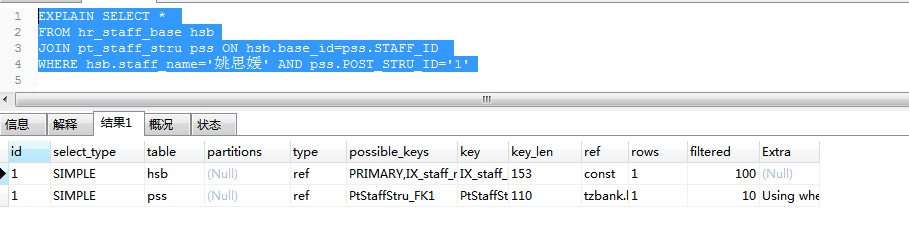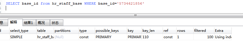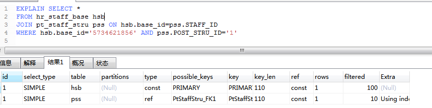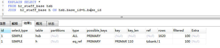 在a表中的id是主键,b表中的id也是主键,该表可以认为是订单表的补充信息表,他们的关系是1对1,在下面的例子中可以看到b表的连接类型是eq_ref,这是极快的联接类型。