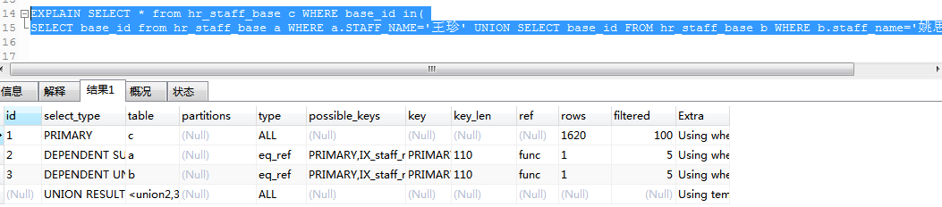 当union作为子查询时,其中第二个union的select_type就是DEPENDENT UNION。