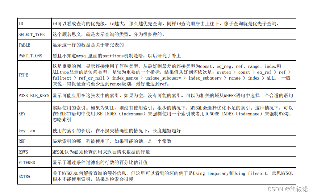 5、Using where:该属性与Using index相反,查询的列并没有被索引覆盖,where条件后面使用的是非索引的前导列,它仅仅是使用了where条件而已。使用了WHERE从句来限制哪些行将与下一张表匹配或者是返回给用户。如果不想返回表中的全部行,并且连接类型ALL或index,是查询有问题不同连接类型的解释(按照效率高低的顺序排序)