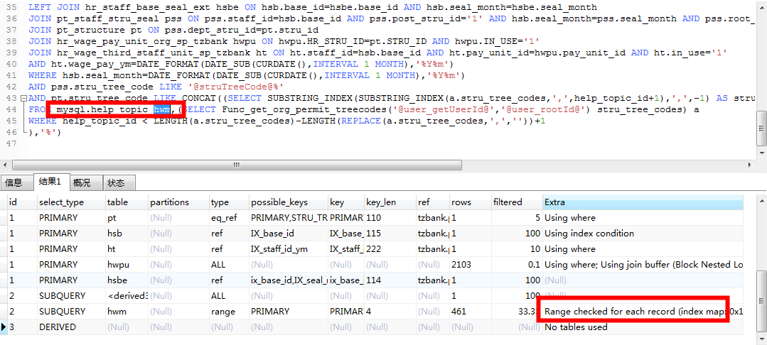 3、Range checked for each Record(index map:#):没有找到理想的索引,因此对于从前面表中来的每一个行组合,MYSQL检查使用哪个索引,并用它来从表中返回行。这是使用索引的最慢的连接之一