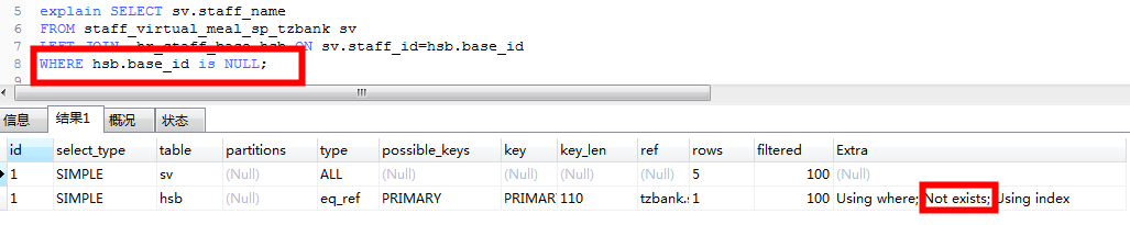 2、Not exists: MYSQL优化了LEFT JOIN,一旦它找到了匹配LEFT JOIN标准的行,就不再搜索了