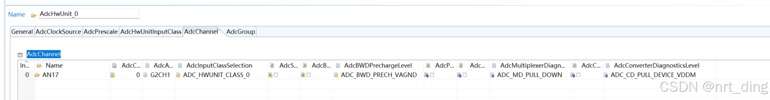 每组ADC里有很多通道,通过AdcAnChannelNum 来区分。这里只配置一个AN17来做试验。