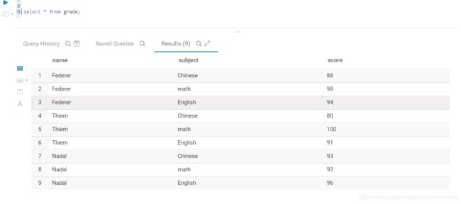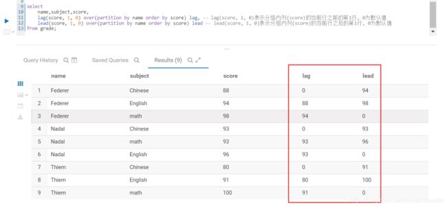 lag(score, 1, 0) over(partition by name order by score) lag, -- lag(score, 1, 0)表示分组内列(score)的当前行之前的第1行, 0为默认值