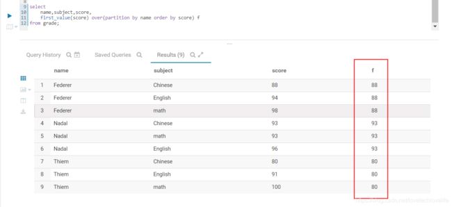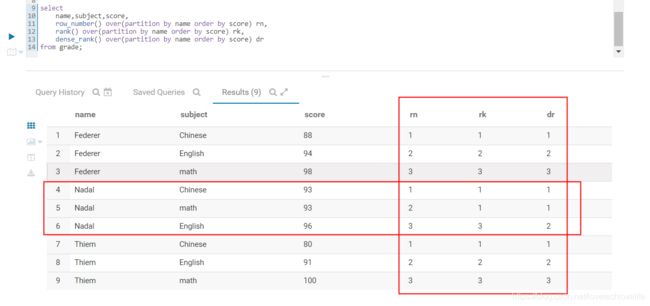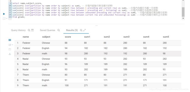 sum(score) over(partition by name order by subject) as sum1, -- 分组内起始行到当前行的和