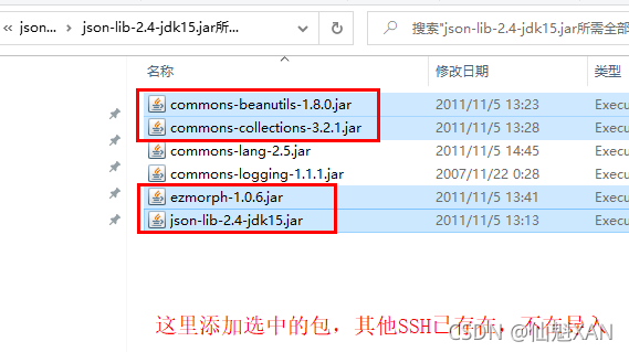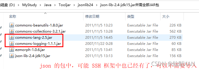 1、引入 json 相关 jar的时候,可能 SSH 中已经存在某些包,可以不导入