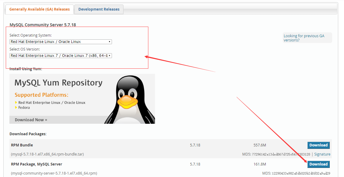如果已经有的话执行命令yum -y remove mysql-libs.x86_64卸载已经安装的MySQL。先到MySQL官网下载5.7.11的安装包(http://dev.mysql.com/downloads/mysql/),download-yum选择RedHat Enterprise Linux 7 / Oracle Linux 7 (Architecture Independent), RPM Package。