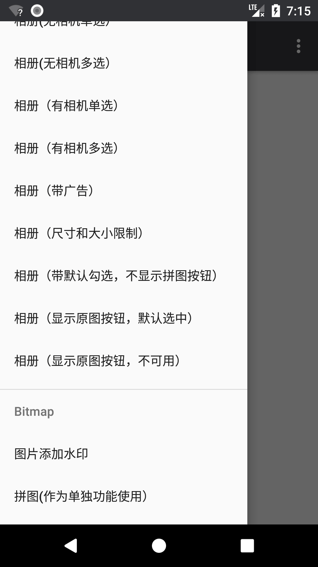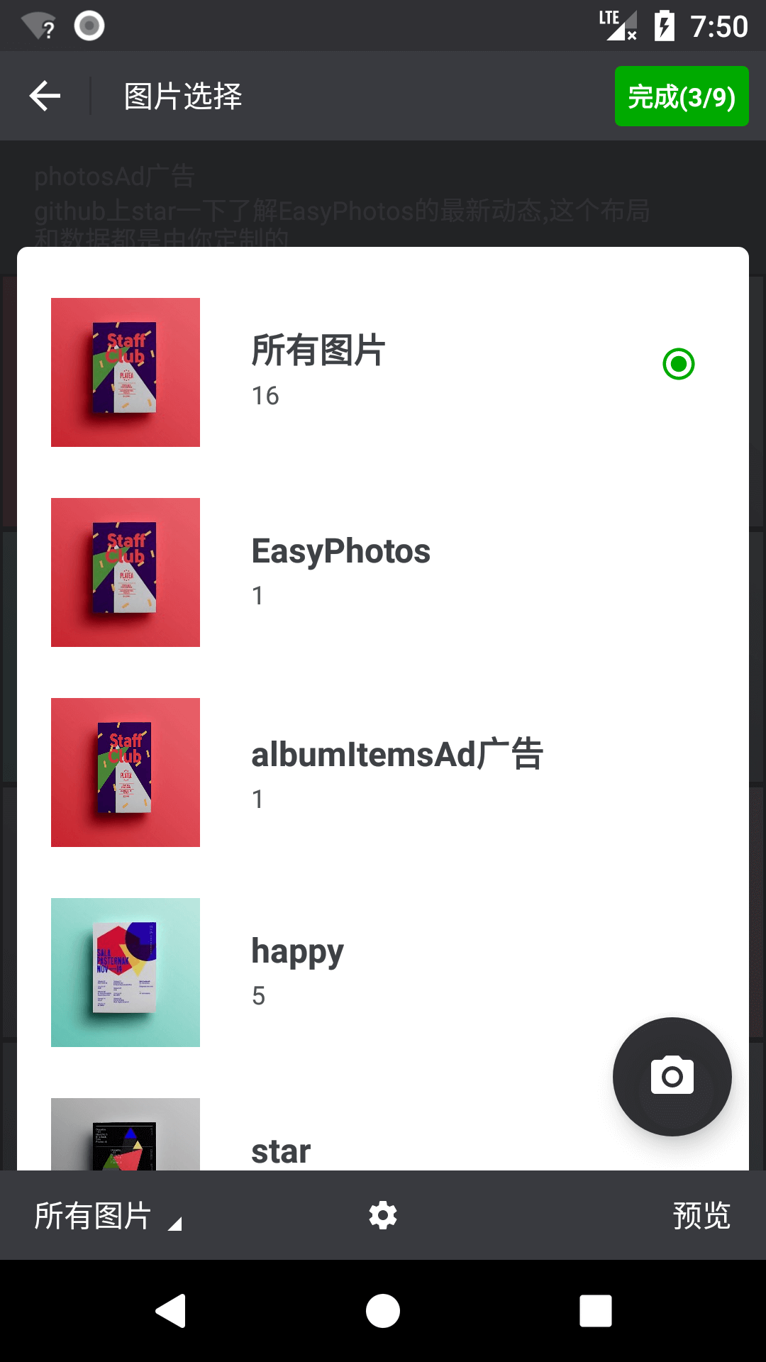 简介: 兼容 android 10,自定义相机拍照,相册选择(单选/多选),文件夹图片选择(单选/多选),视频选择,各界面根据状态栏颜色智能适配状态栏字体颜色变色为深色或浅色,根据使用场景智能适配沉浸式状态栏,内部处理运行时权限,支持 Glide/Picasso/Imageloader 等所有图片加载框架库的带默认勾选选中图片的能填充自定义广告的自定义 Ui 相机相册图片浏览选择器;更有拼图/文字贴纸/贴图/图片缩放/Bitmap 图片添加水印/媒体文件更新到媒体库等众多 Bitmap 图片编辑功能的 android Bitmap 图片处理工具框架库。