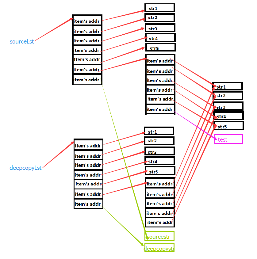 看上面两张图,我们加入左图表示的是一个列表sourcelist,sourcelist = ['str1','str2','str3','str4','str5',['str1','str2','str3','str4','str5']];