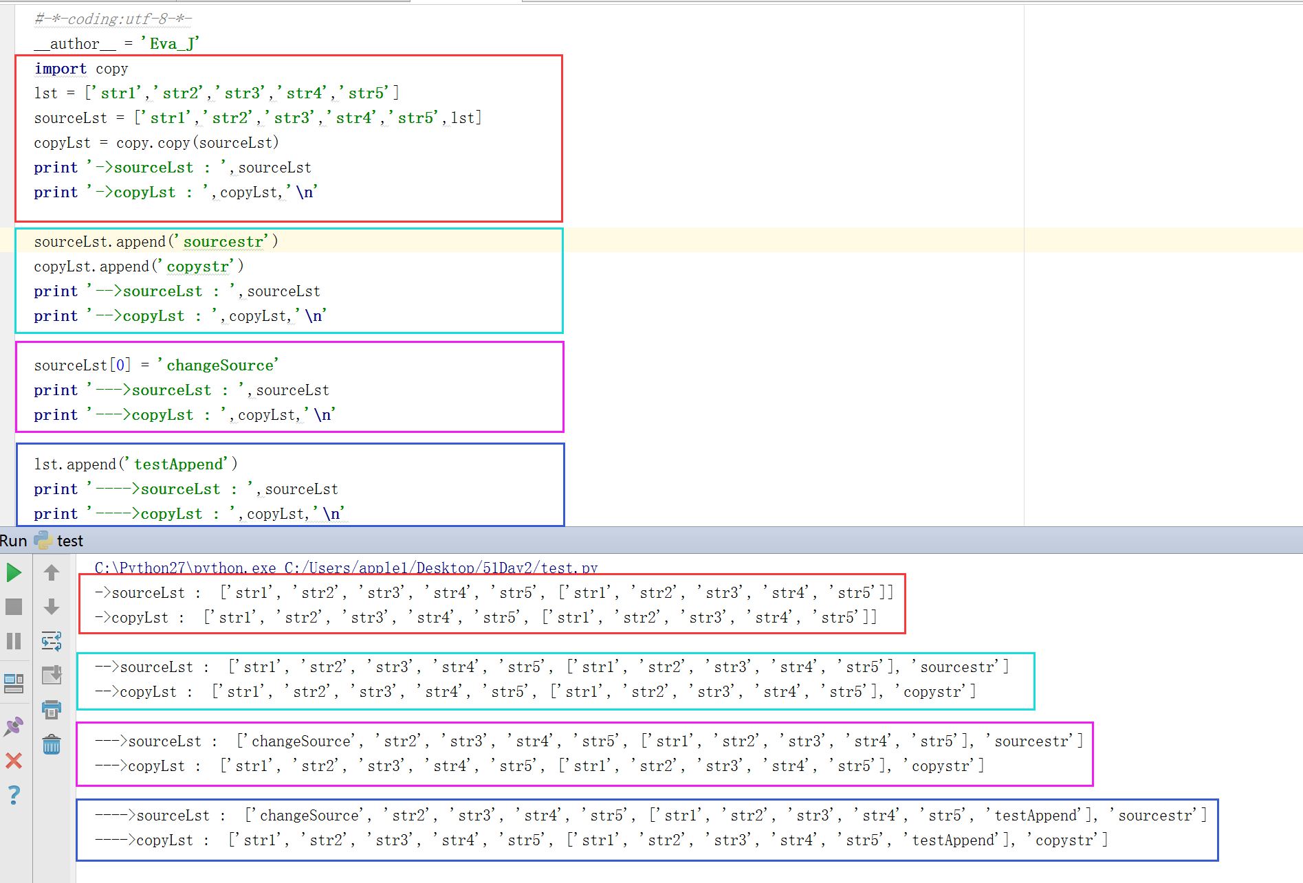 当sourceLst列表发生变化,copyLst中存储的lst内存地址没有改变,所以当lst发生改变的时候,sourceLst和copyLst两个列表就都发生了改变。