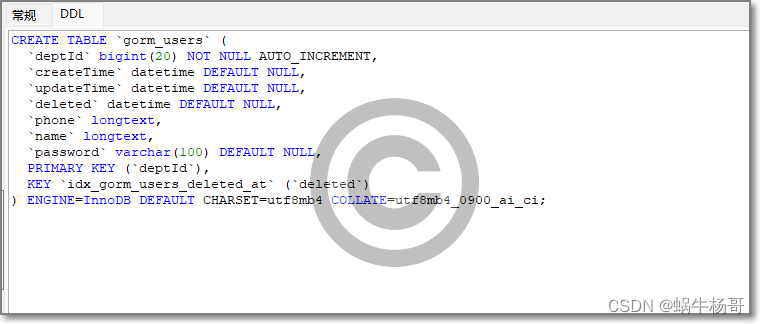 type GormUser struct { // 约定主键为ID才会自动创建,数据库的主键为id,二不是解析的deptId,但可用在创建之后通过重命名的方式修改列名