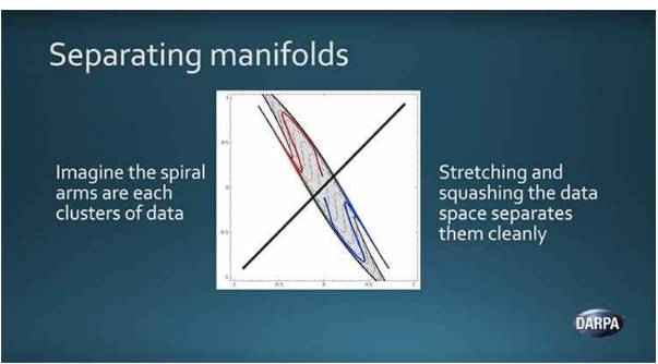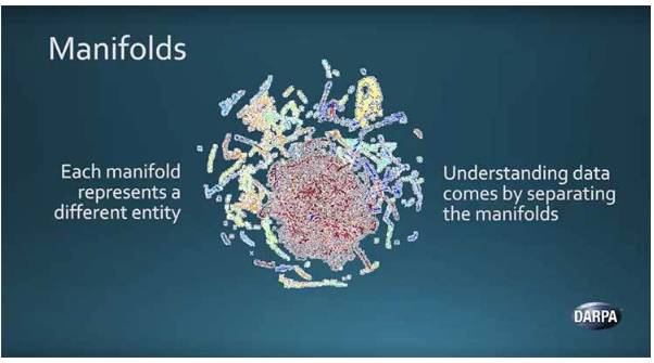 作为目前人工智能浪潮的第二波,深度学习算法因为 Launchbury 所说的「流形假设(manifold hypothesis)」(见下图)而更加有效。简单解释,它指代不同类型的高维自然数据如何聚成一块,并在低维可视化中有不同的形状。