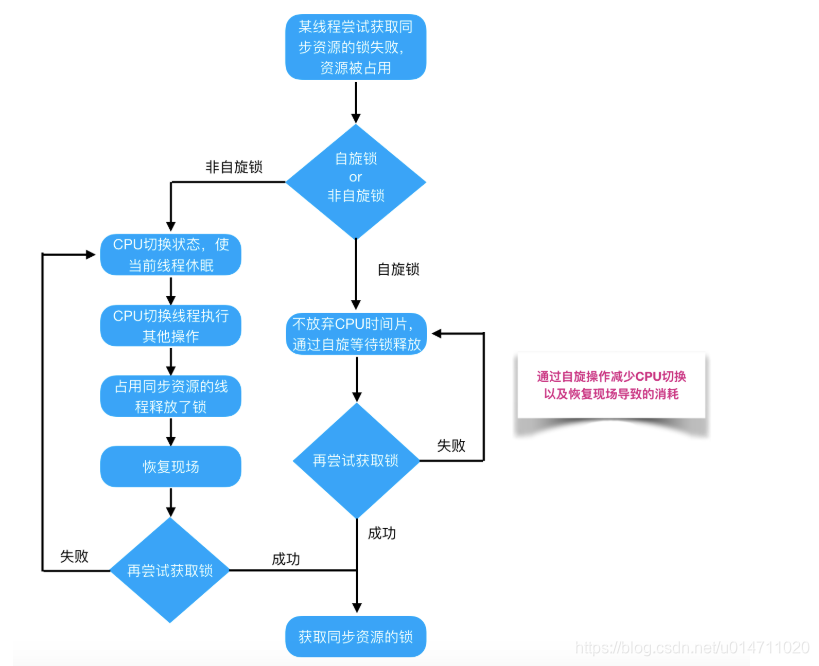 而为了让当前线程“再次获取”,我们需让当前线程进行自旋,如果在自旋完成后前面锁定同步资源的线程已经释放了锁,那么当前线程就可以不必阻塞而是直接获取同步资源,从而避免切换线程的开销,这就是自旋锁。