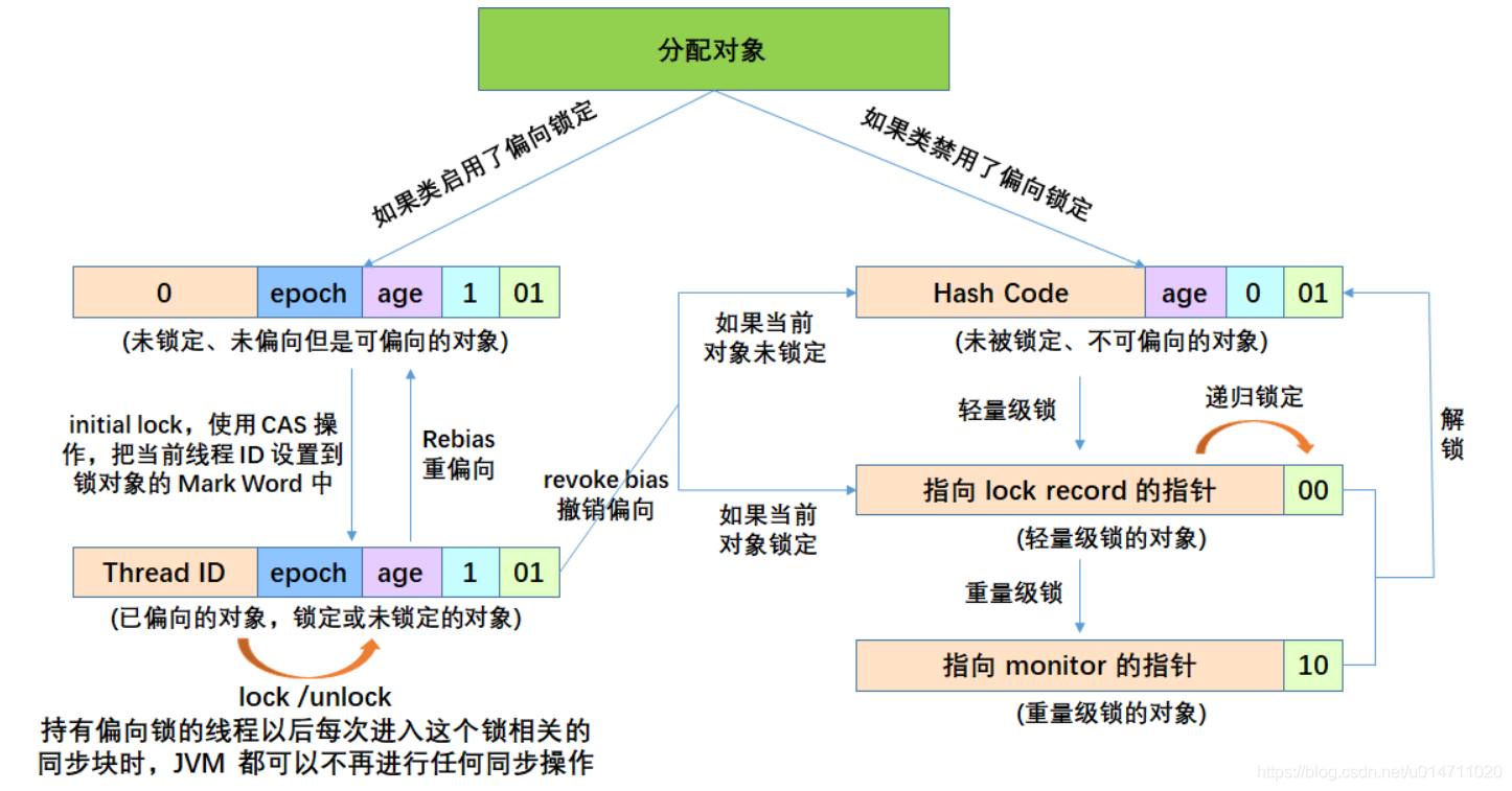 这四种状态是在jdk1.6之后引入的,分别为:(无锁->偏向锁->轻量级锁->重量级锁 ) 这几个状态会随着竞争情况逐渐升级,锁状态只能升不能降级。