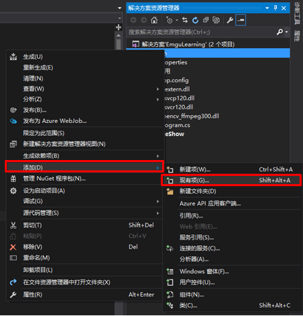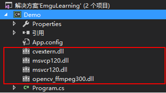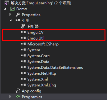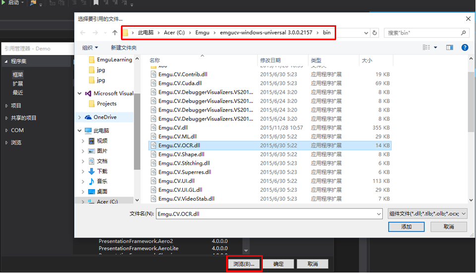 - 添加Emgu引用——从Emgu安装目录下的bin文件夹中添加库引用: