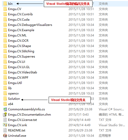 址为:http://pan.baidu.com/s/19haRO。下载得到的是一个名称为libemgucv-windows-universal-3.0.0.2157.exe的安装程序,安装完成后,在安装目录内如如图: